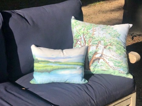 My daughter-in-law’s art on pillows – Garden Party views…